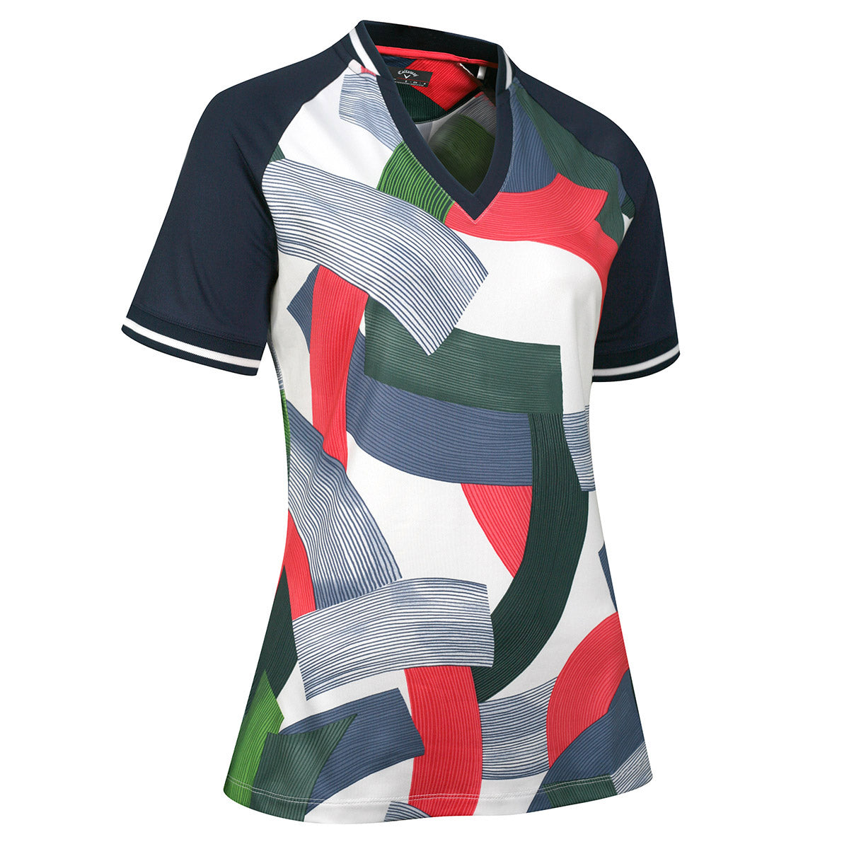 Bring fashion to the fairways with this brilliant brush-stroke polo shirt from Callaway. Featuring green, navy blue, coral red and white strokes on the front and back panels, solid navy blue sleeves with ribbed cuffs and a v-neck opening for a fabulous feminine finish. The silky-soft fabric contains added stretch for maximum range of movement and is complete with Opti-Dri technology to keep you cool and dry all day long. This polo would look equally gorgeous with your golfing gear, or your favourite pair of jeans.