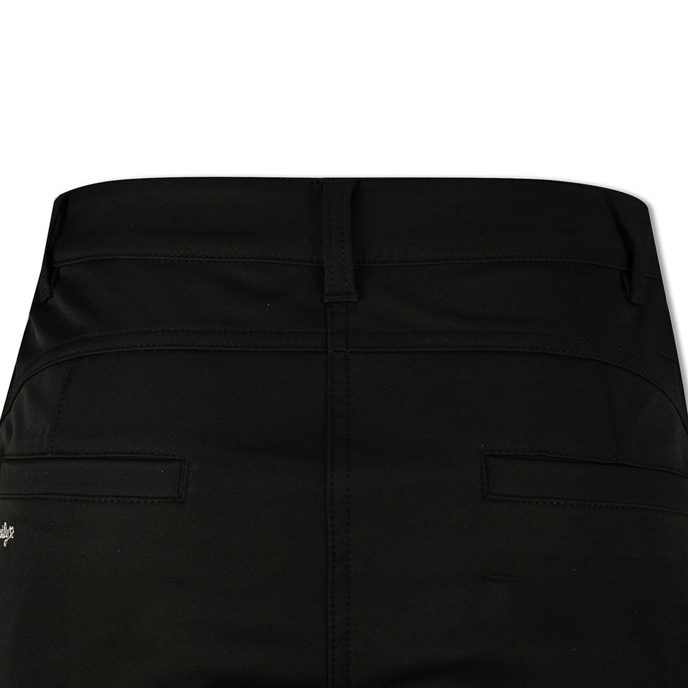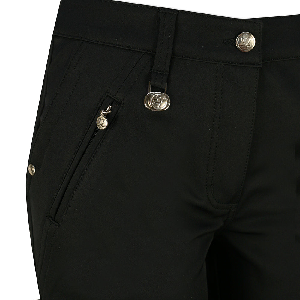 Soyez à la hauteur cette saison avec ce pantalon chic Black Daily Sports Thermal Pro-Stretch. La magnifique coupe de ce pantalon à jambe droite offre un contour époustouflant, vous laissant vous sentir fabuleuse avec une magnifique silhouette féminine. Conçu pour s'adapter à votre taille naturelle qui doit être sur ou près de votre nombril et se ferme avec une fermeture éclair et un bouton unique. Les cinq passants de ceinture profonds sont soigneusement placés autour de la taille et portent le marque-balle argenté de Daily attaché à la boucle avant droite. Deux poches coupées ouvertes avec des rivets en métal argenté se trouvent sur le devant, avec une fausse poche zippée supplémentaire en dessous ; tandis que deux poches passepoilées sont présentes à l'arrière. Doux au toucher, déperlant et coupe-vent également, sans être lourd à porter. Le tissu doublé en polaire est extrêmement respirant pour que vos jambes restent bien au chaud, sans surchauffe. Le logo cœur Daily Sports se retrouve sur tous les détails métalliques ; rivets, tirettes de fermeture éclair, bouton et marqueur de balle. Tandis que le logo Daily Sports est brodé en fil métallisé argenté juste en dessous de la poche arrière gauche.