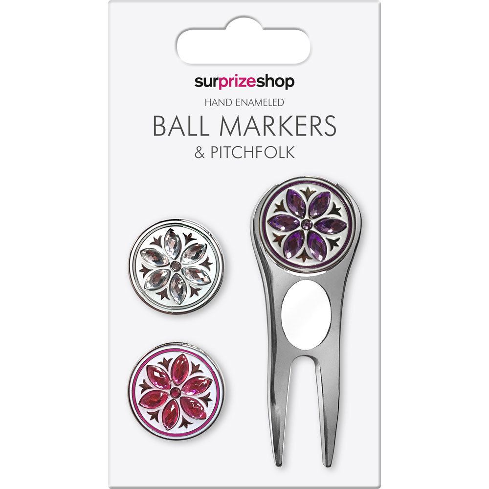 Égayez votre jeu avec ce joli ensemble de marqueur de balle et de fourche assortie de Surprizeshop. Doté d'un motif de paillettes et de cristaux en blanc, violet et rose vif, cet ensemble est robuste, durable et émaillé à la main afin que vous puissiez les nettoyer facilement. C'est le cadeau parfait pour la golfeuse de votre vie. Ensemble de 3 fourches émaillées à la main
