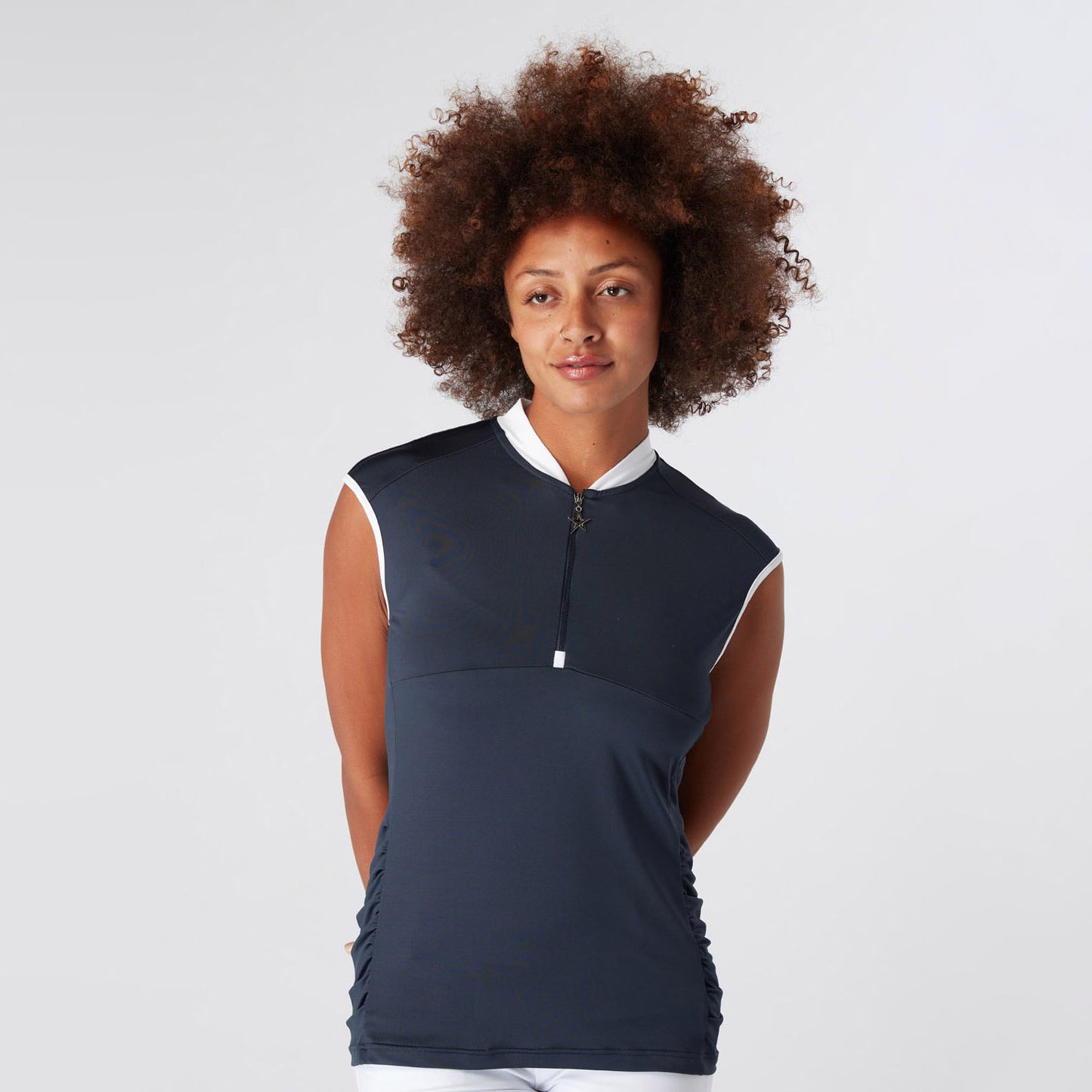 Swing Out Sister Ladies Cap Sleeve Polo with Ruched detail in Navy Blazer
