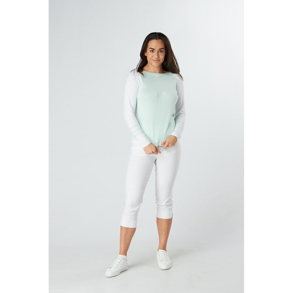 Chaque golfeur a besoin de pièces de transition dans sa garde-robe pour traverser les saisons avec style. Ce magnifique haut de Swing Out Sister est l'un de ces essentiels : un pull extensible à manches longues, super doux avec un look sport-luxe. Conçu en vert menthe pâle et blanc avec un style color block ; une coupe légère et confortable donne une forme moderne. Le tricot respirant et facile d'entretien avec des panneaux en maille sur les côtés le rend si facile à porter. Sa nature polyvalente signifie qu'il fonctionnera aussi bien avec des jupes-shorts, des shorts ou des pantalons sur le parcours qu'avec un jean pour prendre un café en ville. Jetez un œil au capris assorti pour une tenue gagnante !