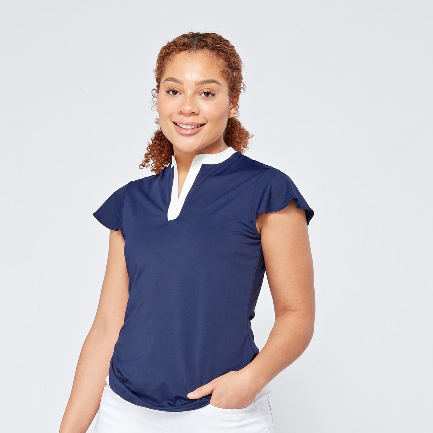 Unlock your potential on the course with this gorgeous cap sleeve polo in classic navy blue. Designed with a stylish ribbed v-neck placket that leads to a mandarin collar in contrasting white and floaty cap sleeves for a fabulous feminine finish. Part of the ELITE collection (Enhanced, Lightweight, Innovative, Technical, Engineered) which uses the latest technical fabrics and engineering processes to offer enhanced stretch, breathability and movement, the silky material is not only easy-care but will feel ultra-soft against your skin ensuring total comfort all day long.