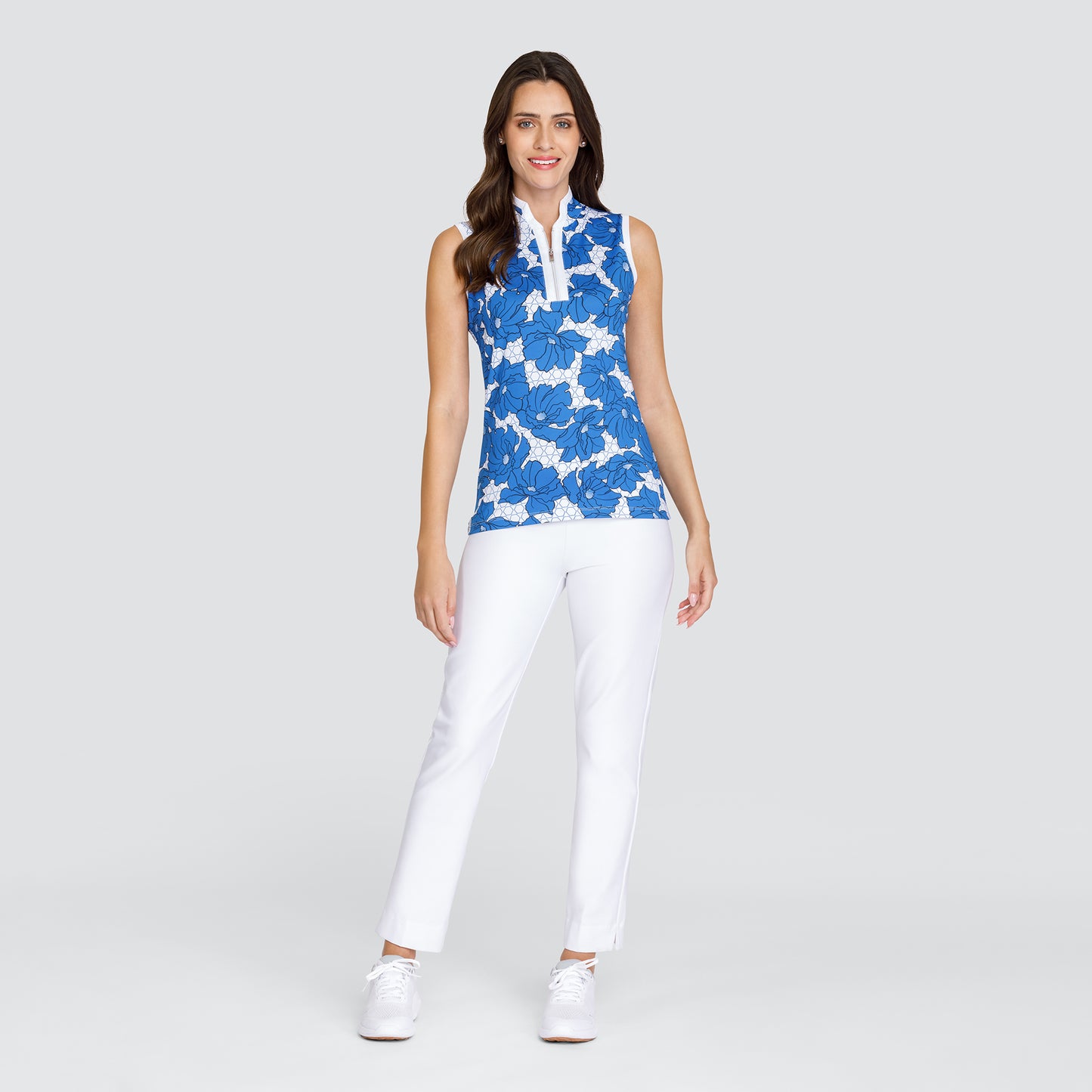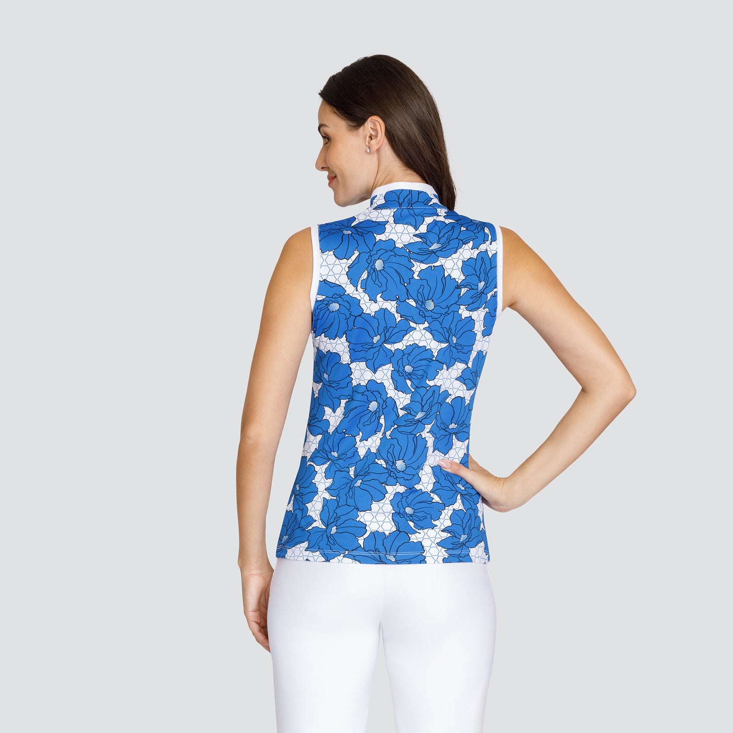 - 'Avarae' sleeveless polo in 'Sicily Blooms'; a blue and white floral and hexagonal print