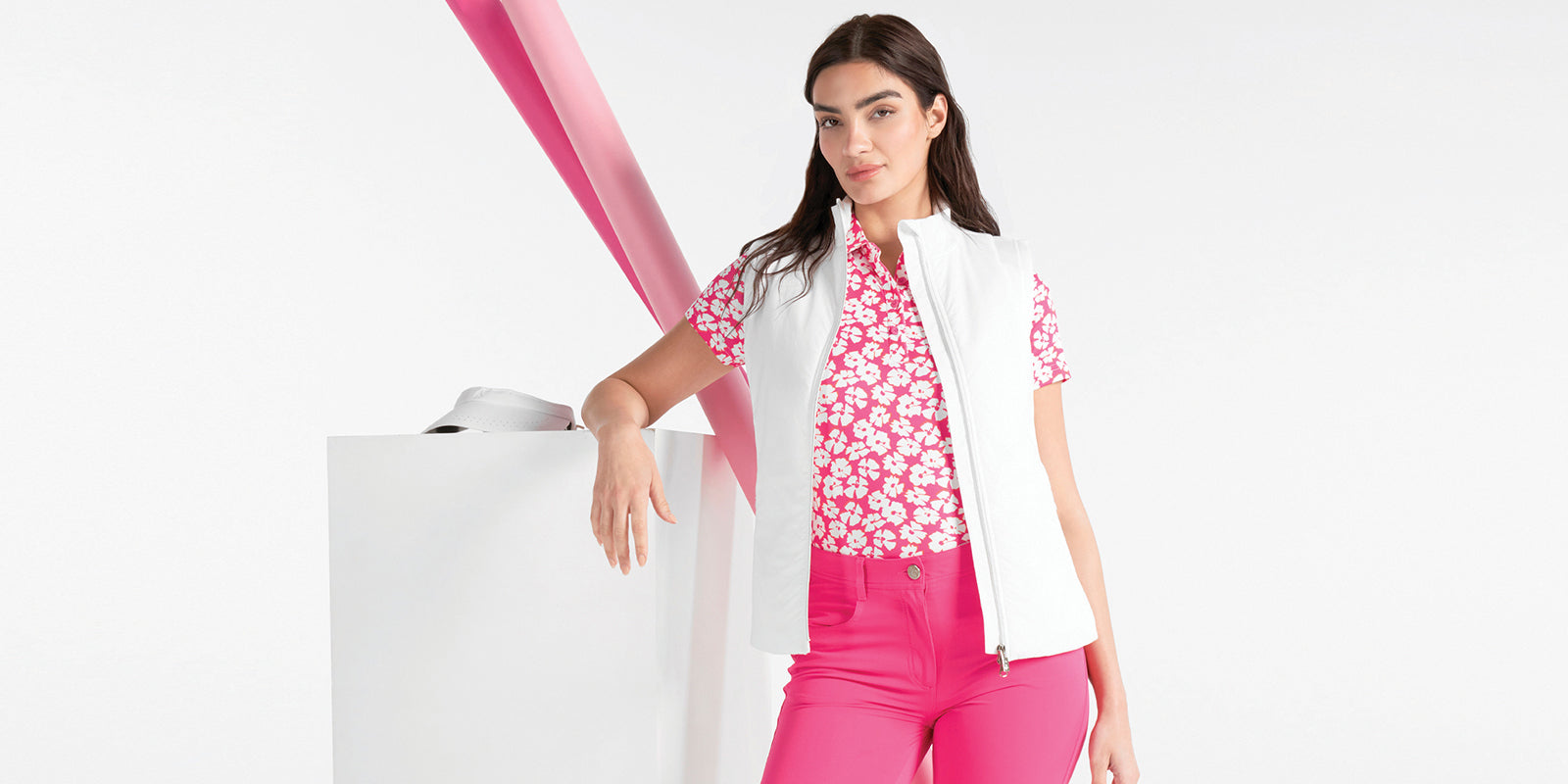 Green Lamb women's golf clothes spring summer 2025 pink flower print polo with white lightweight gilet, available at GolfGarb