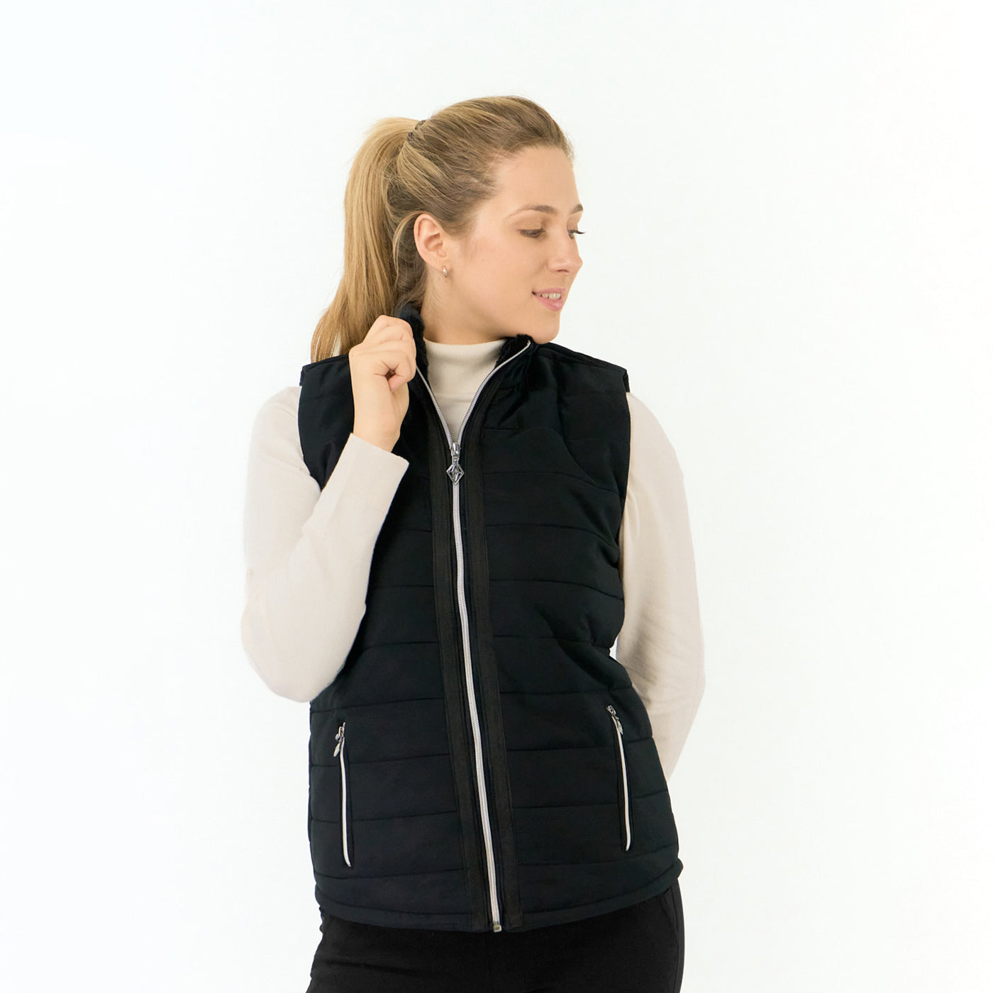 - Zilveren ritssluiting over de gehele lengte met logo-trekker om de kraag op te zetten