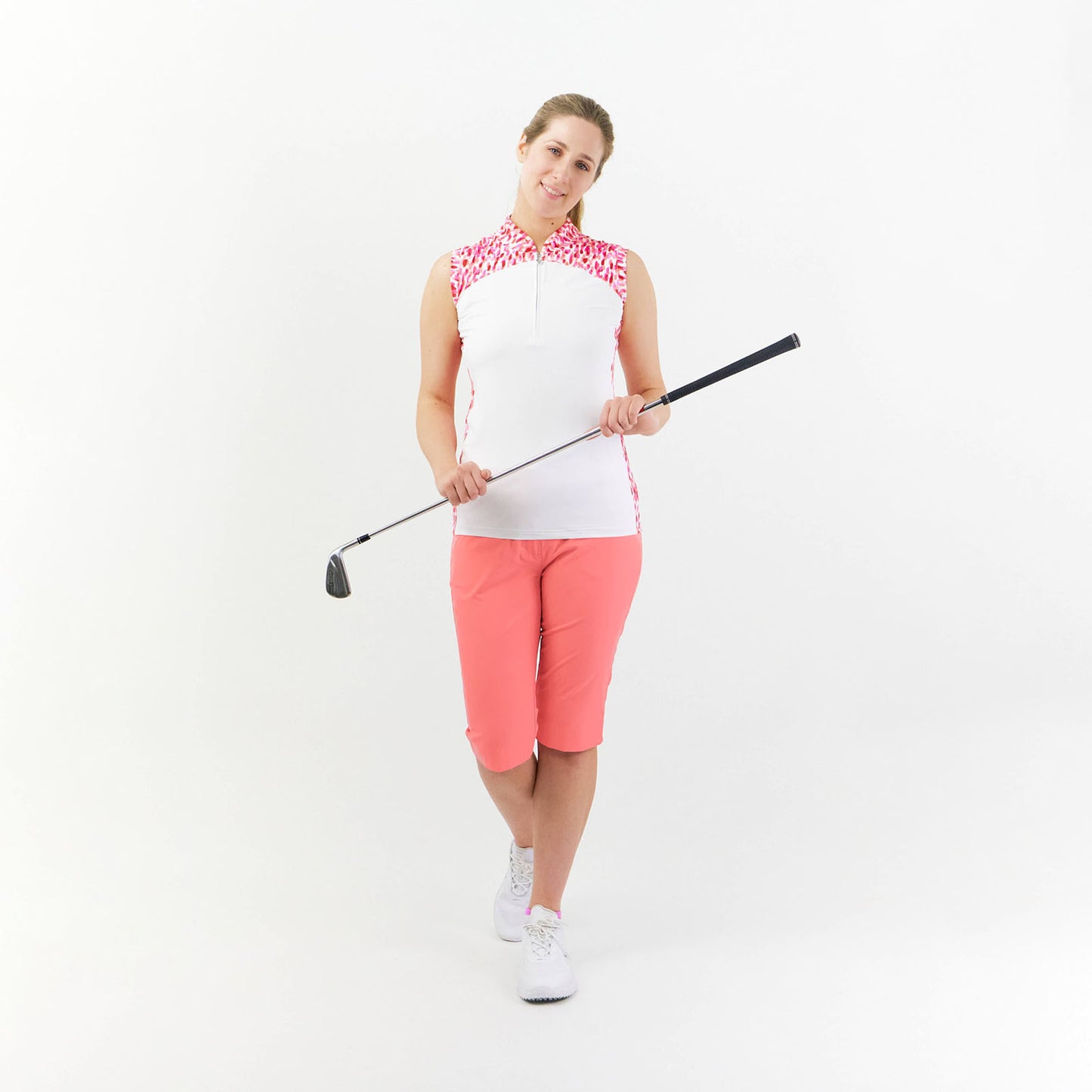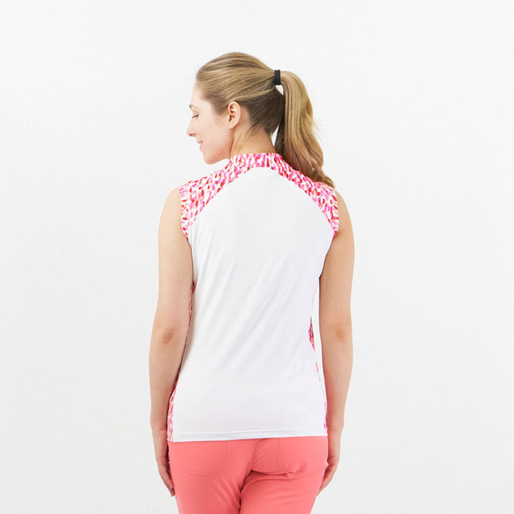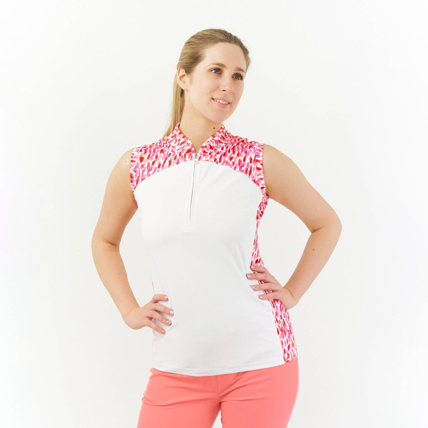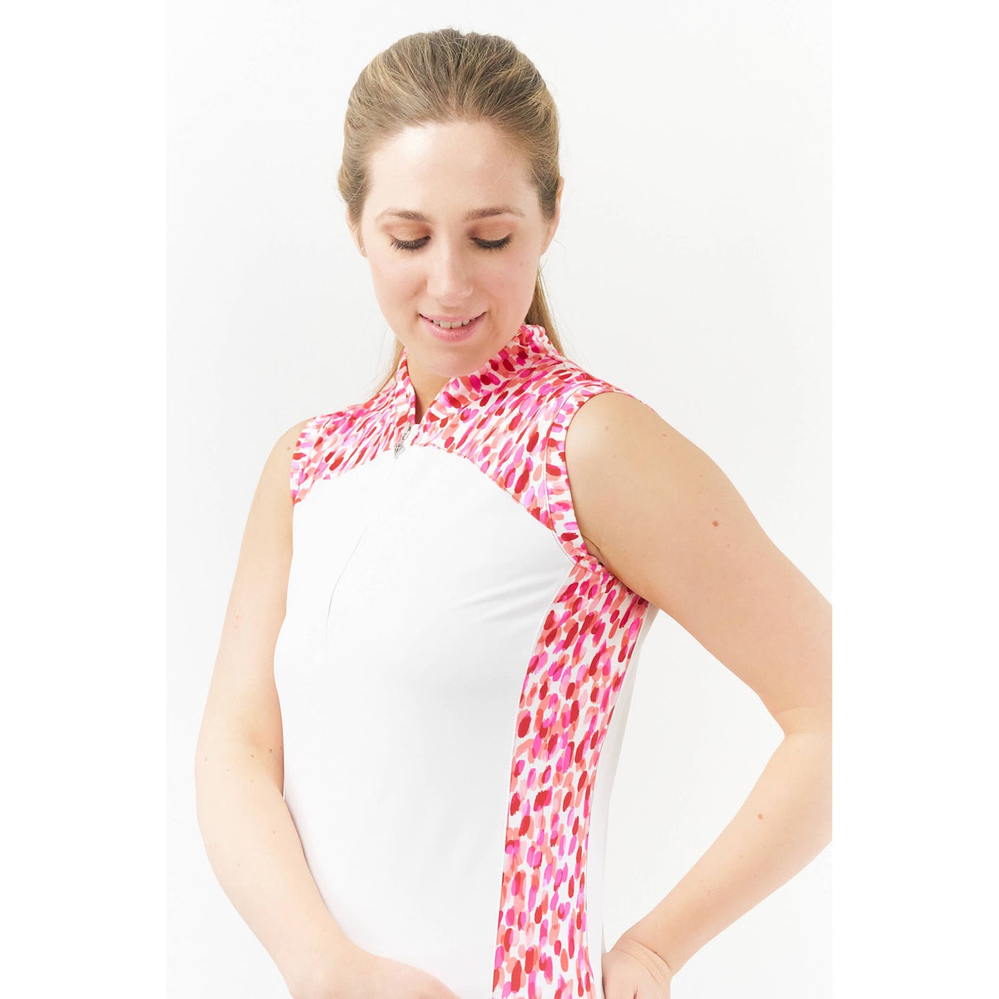 - Mouwloze polo van 'Freda' in het wit met 'Petal Polka'-print - een koraaloranje en roze penseelstreekontwerp met rode accenten