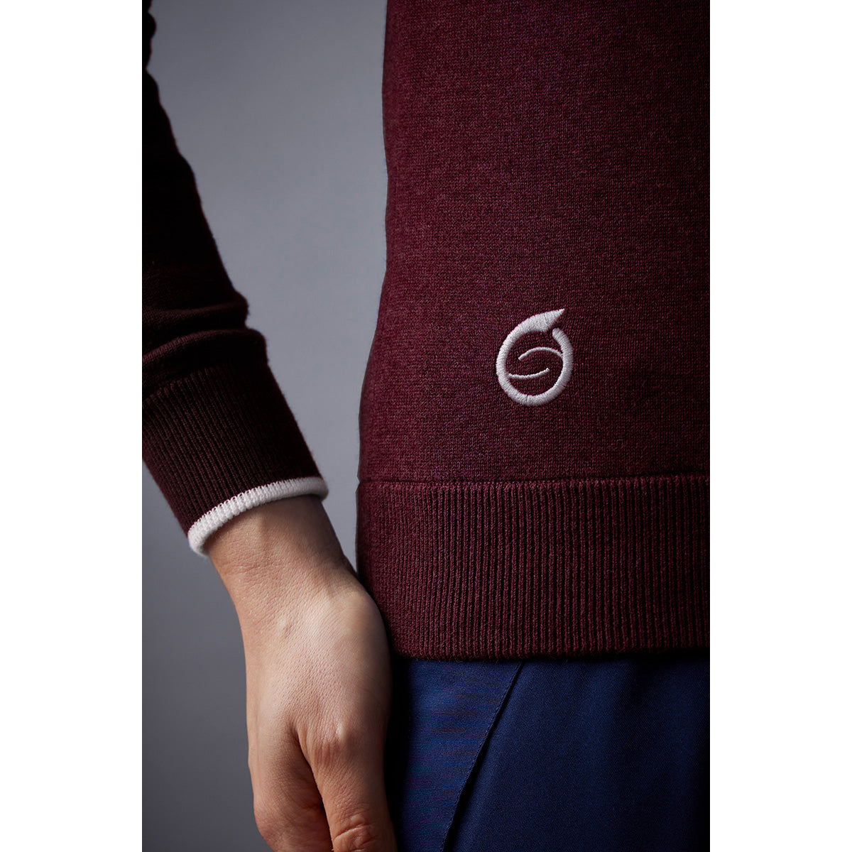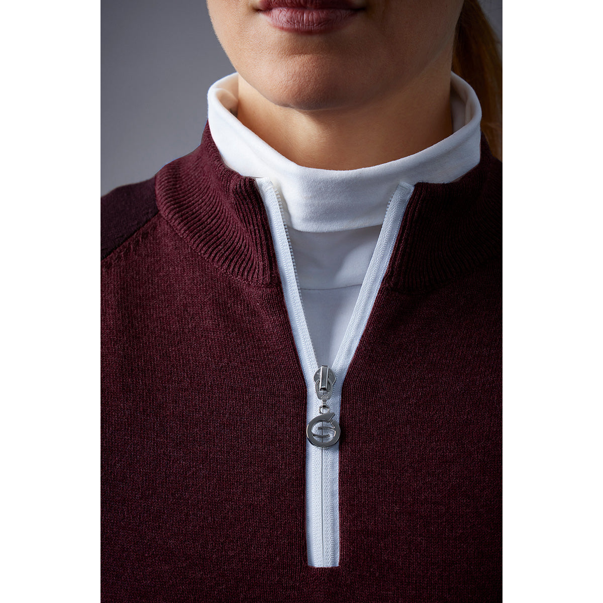 - Contrasterende kleur ritshals, zilveren logo ritstrekker naar aparte geribbelde kraag met contrasterende binnenkant