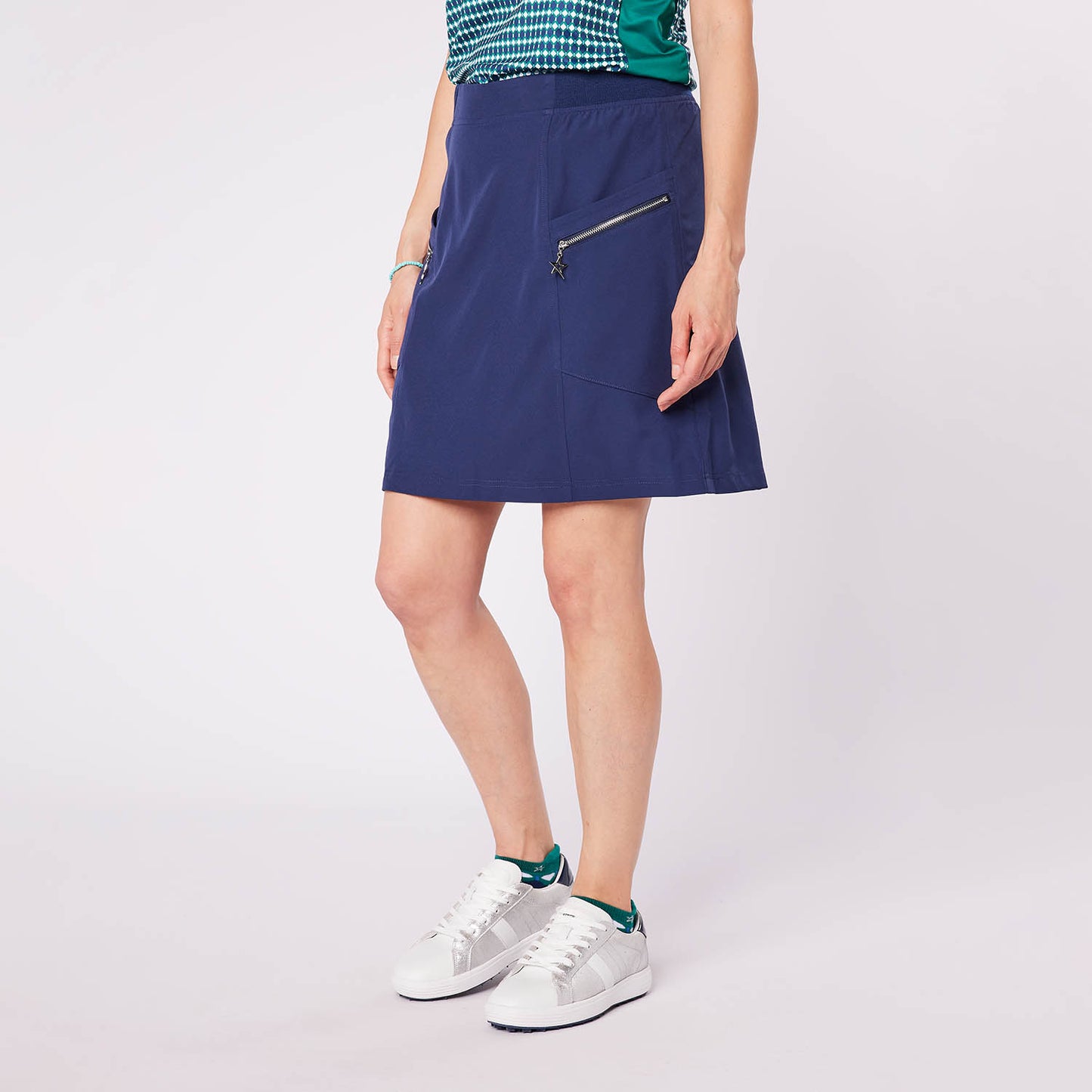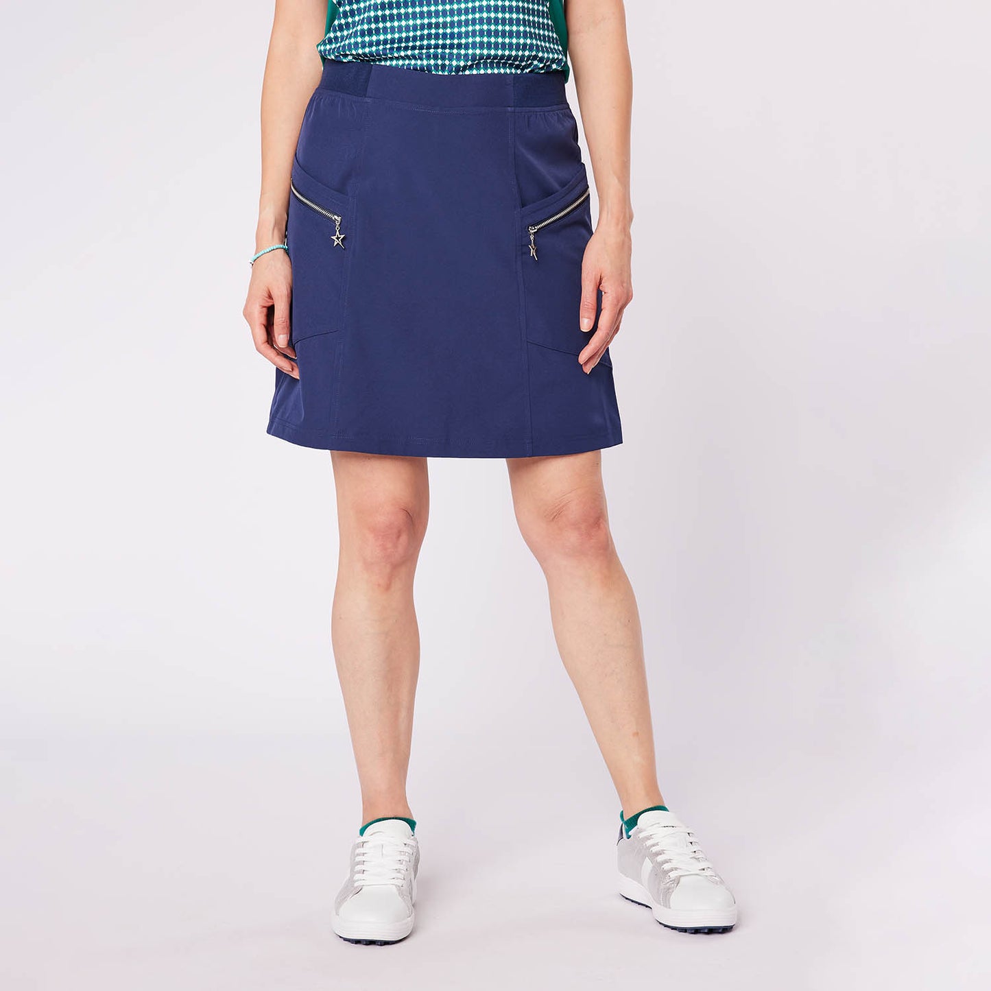 Swing Out Sister Ladies Lightweight Pull-On Skort with Silver Pocket Detail in Navy