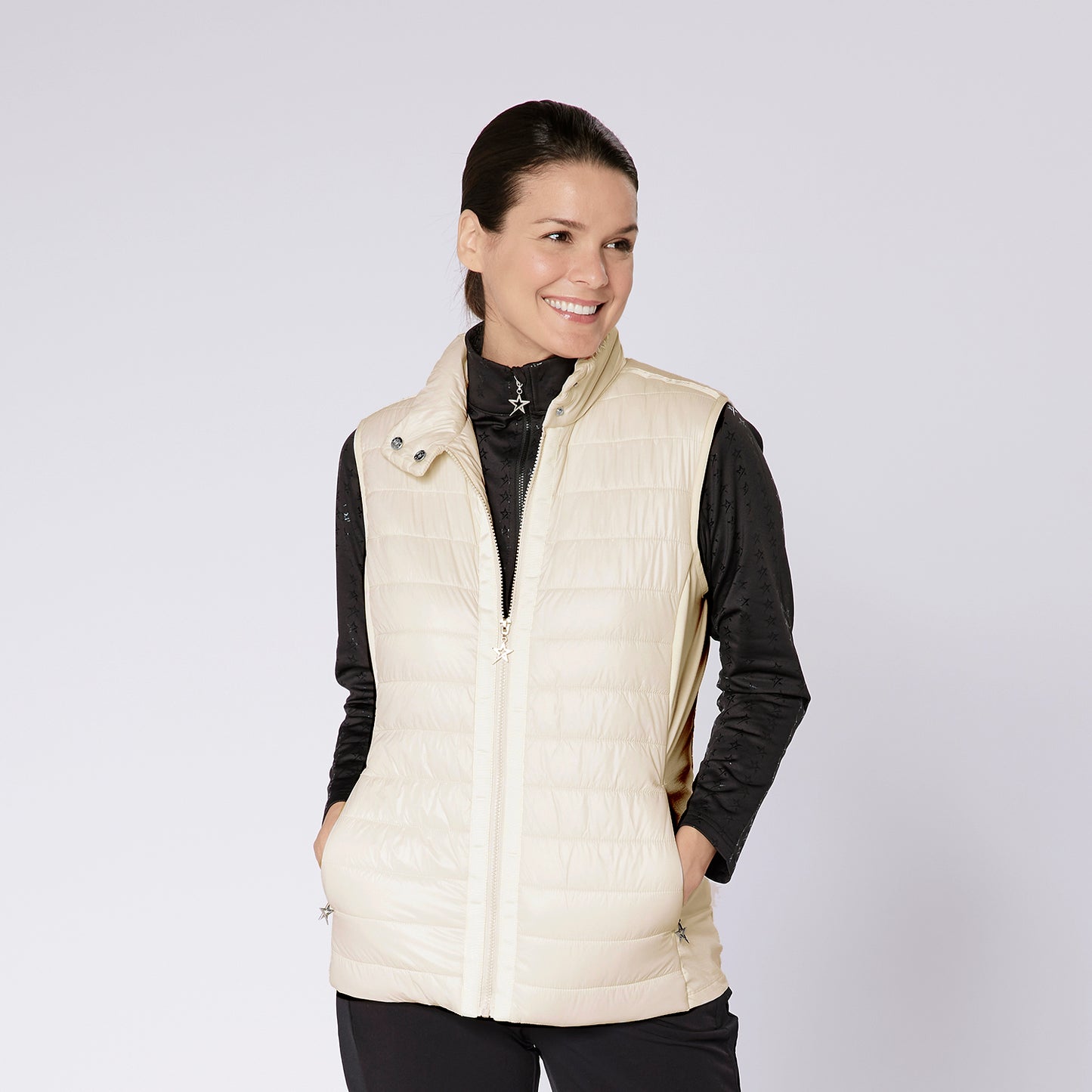 - Volledige ritssluiting met ritstrekker met sterrenlogo en sluiting met 2 drukknopen in de nek
