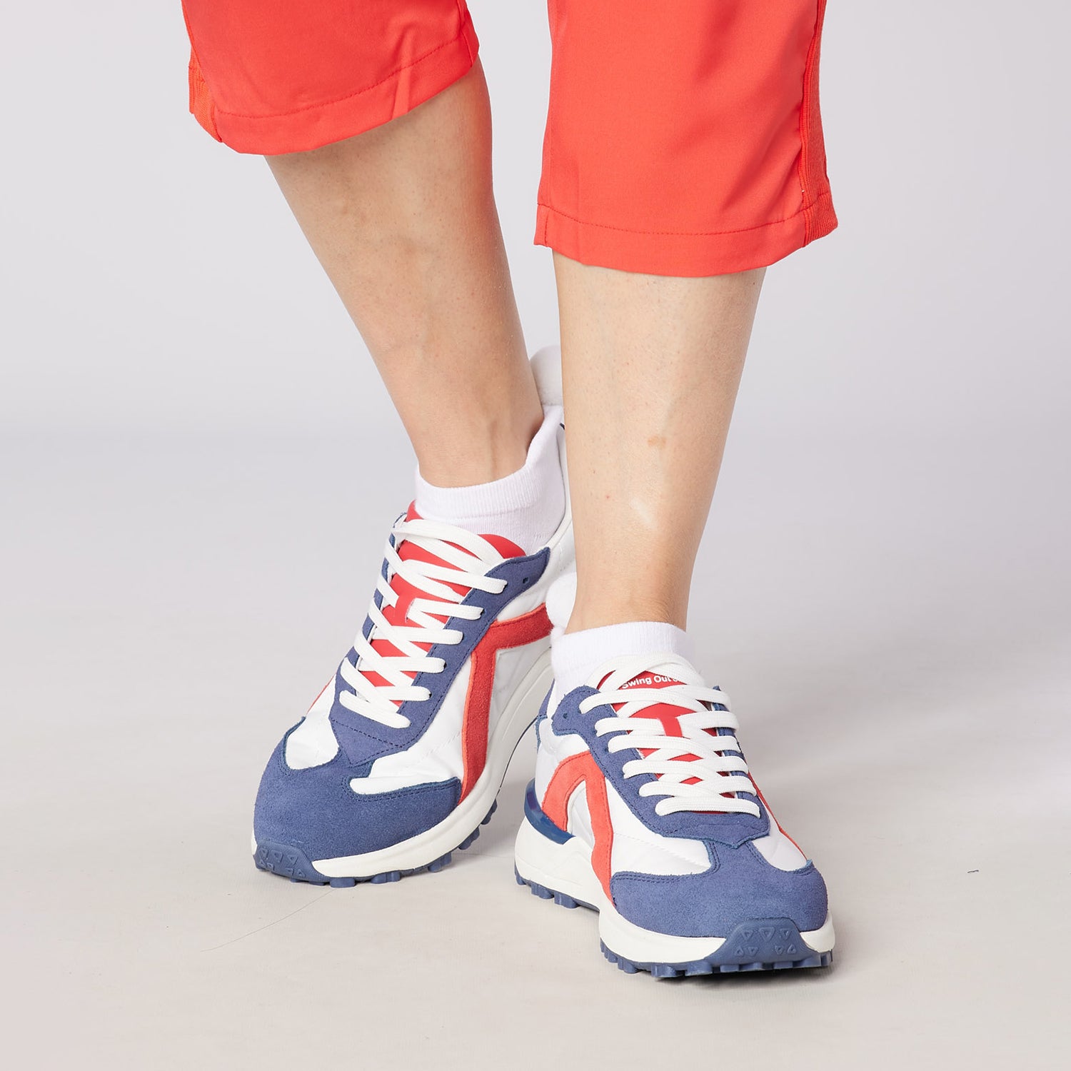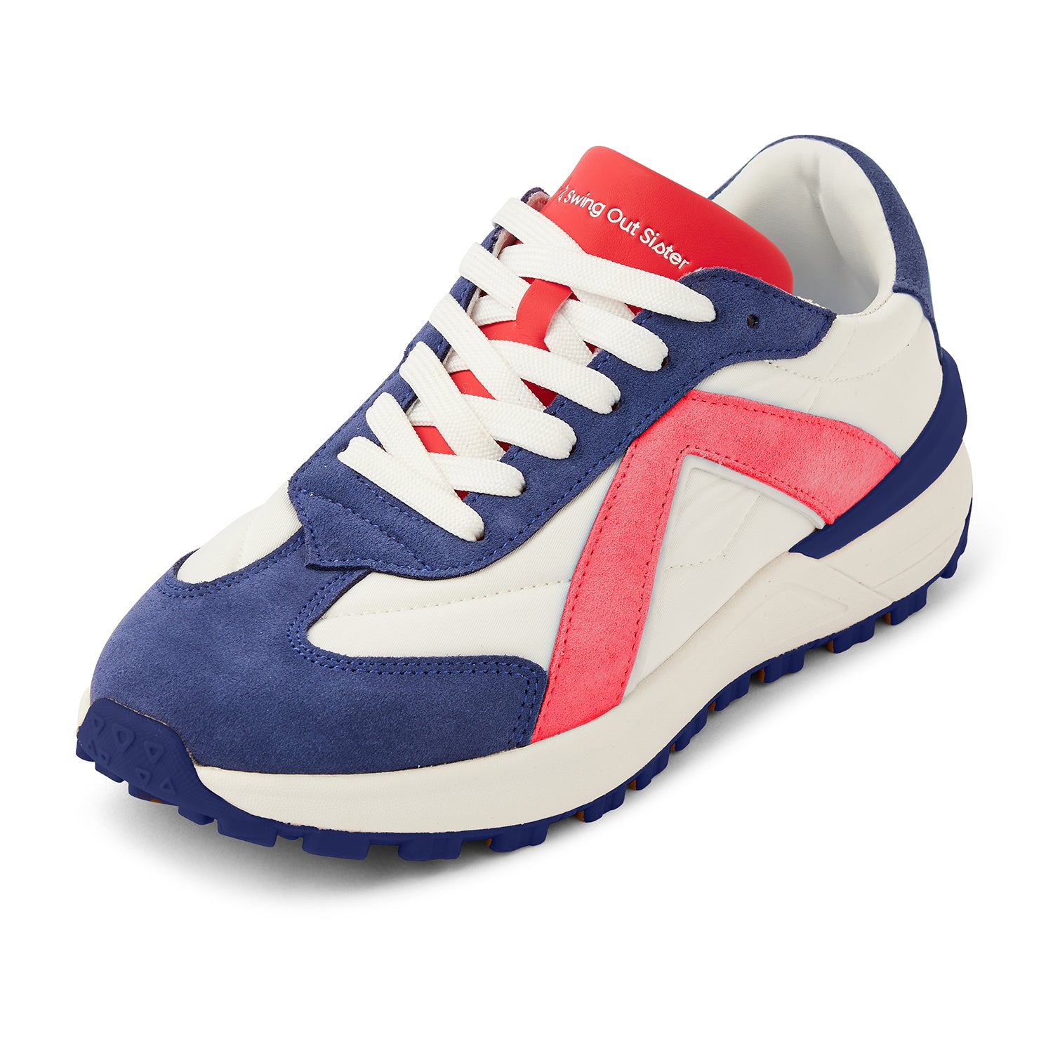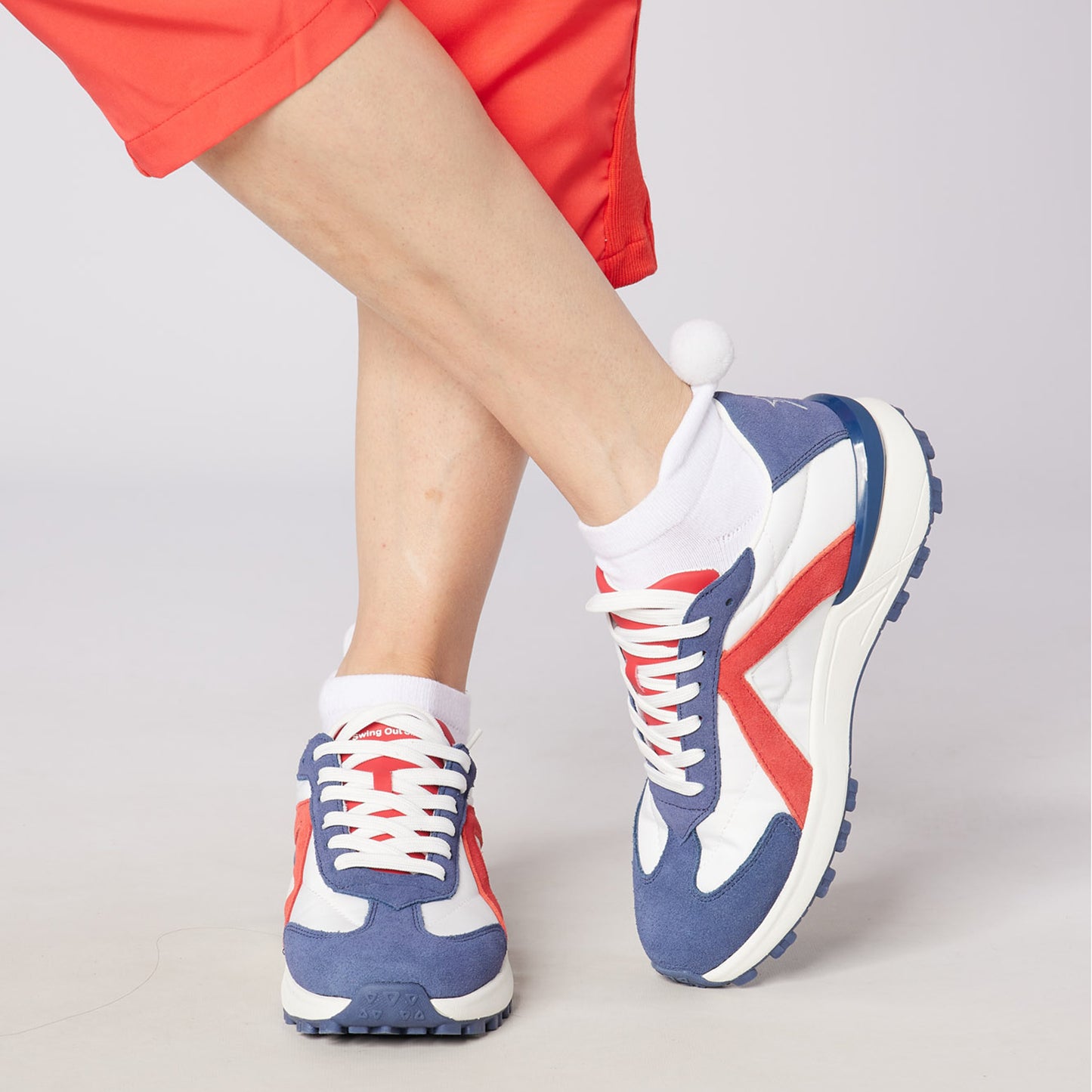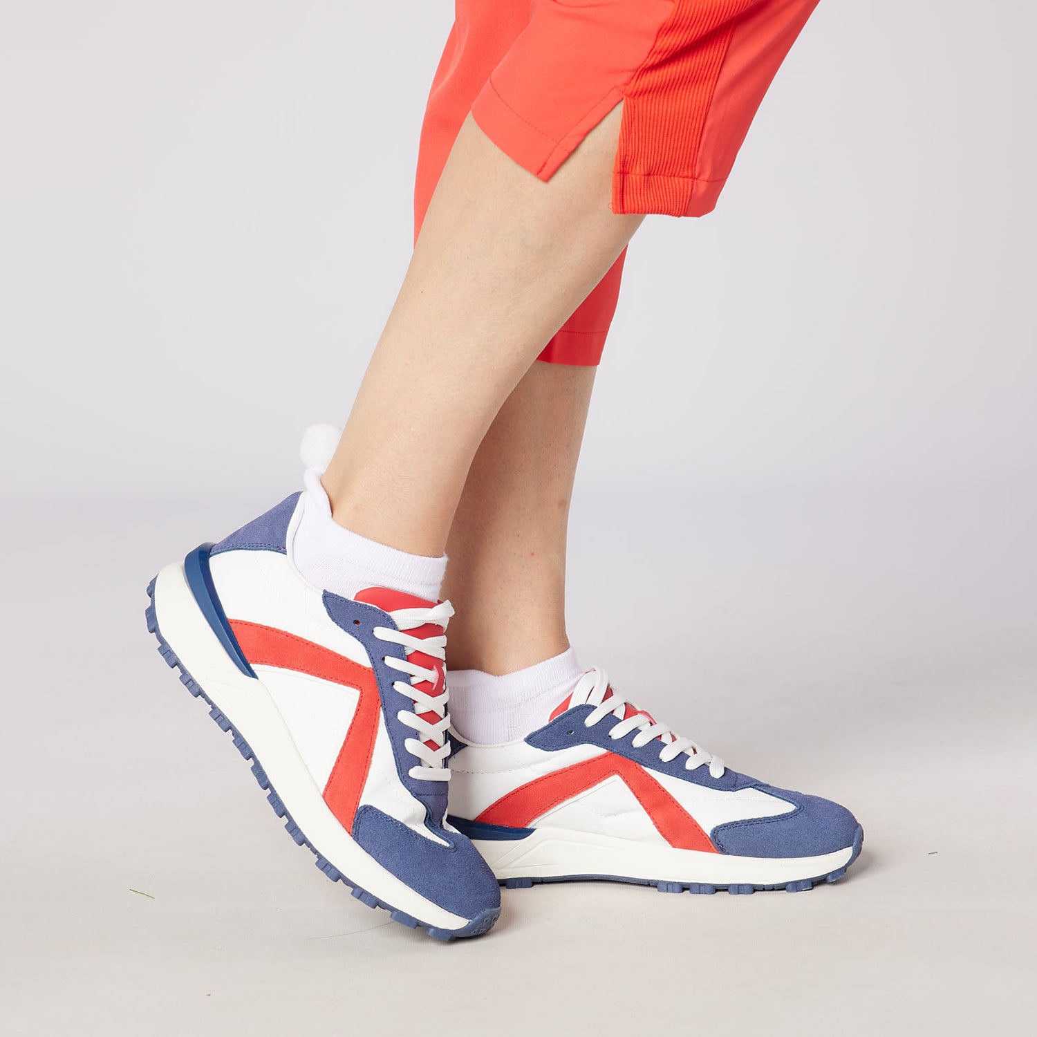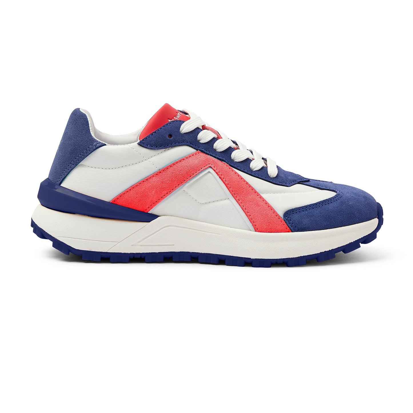 - Styled in white with blue and red suede panels