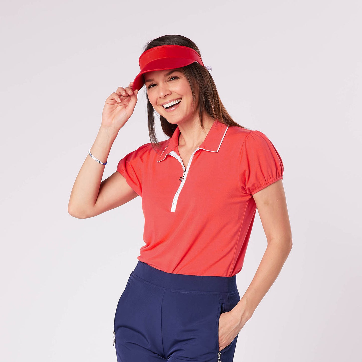 - "Minny" Puffed cap sleeve polo shirt in 'Coral & White'