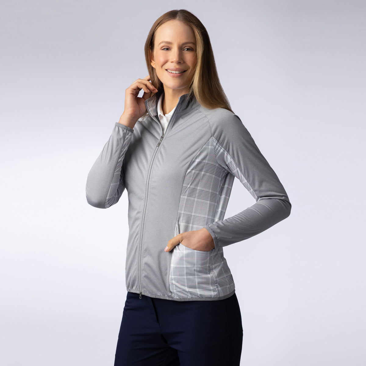 - 'Poppy' lightweight golf jacket in light grey marl & white/candy check