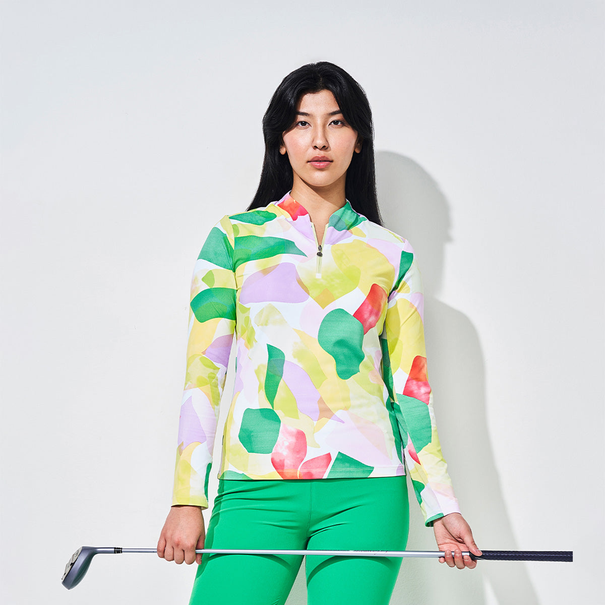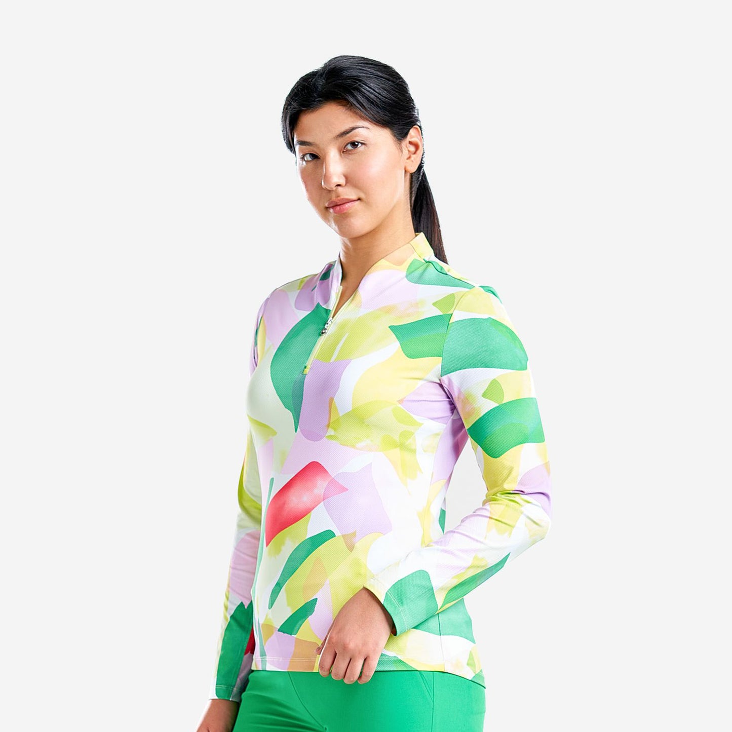 - 'Lolita' long sleeve polo in 'Classic Green' with abstract print in greens, yellow, pink and white