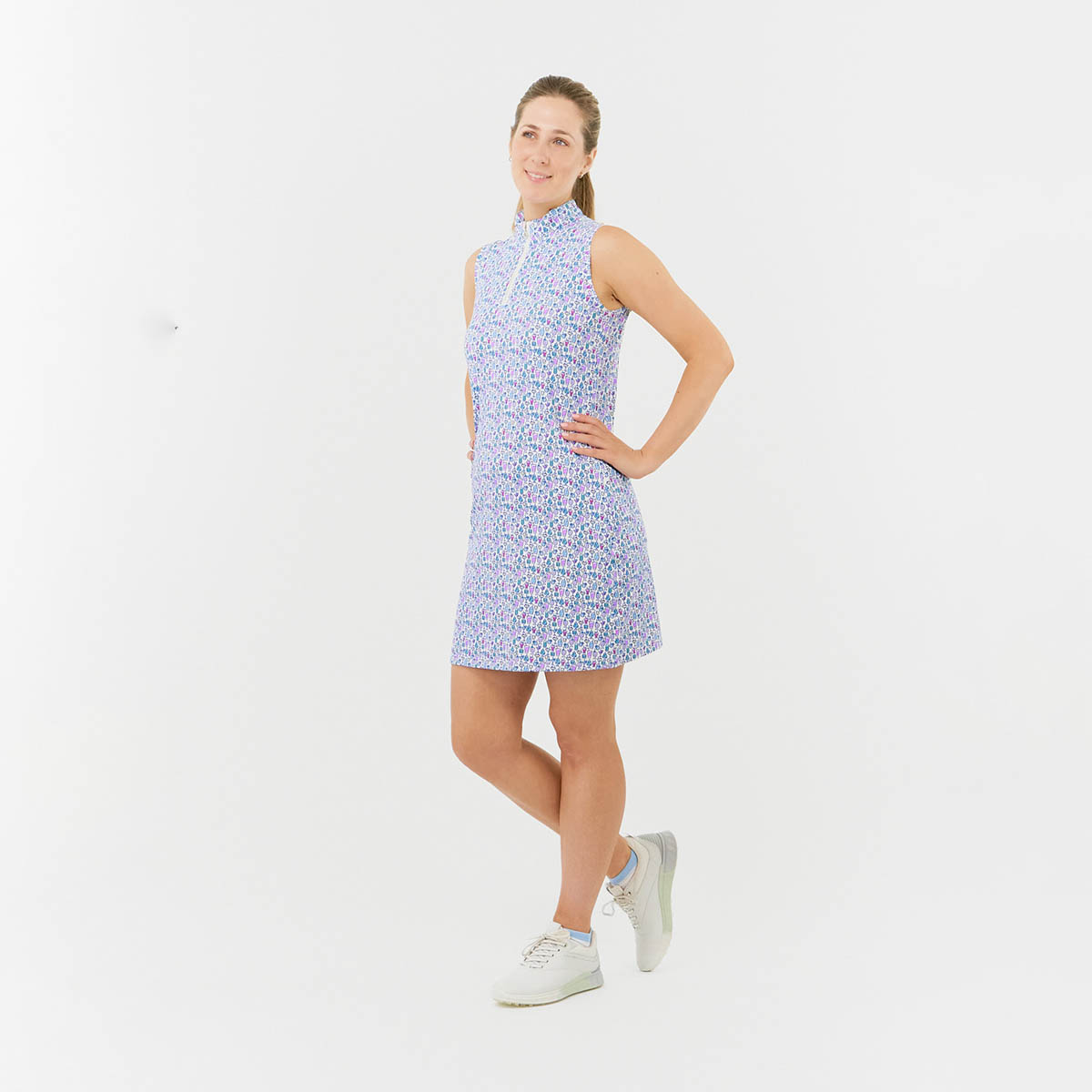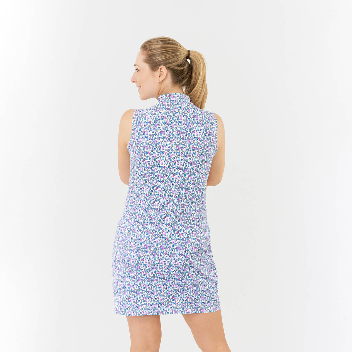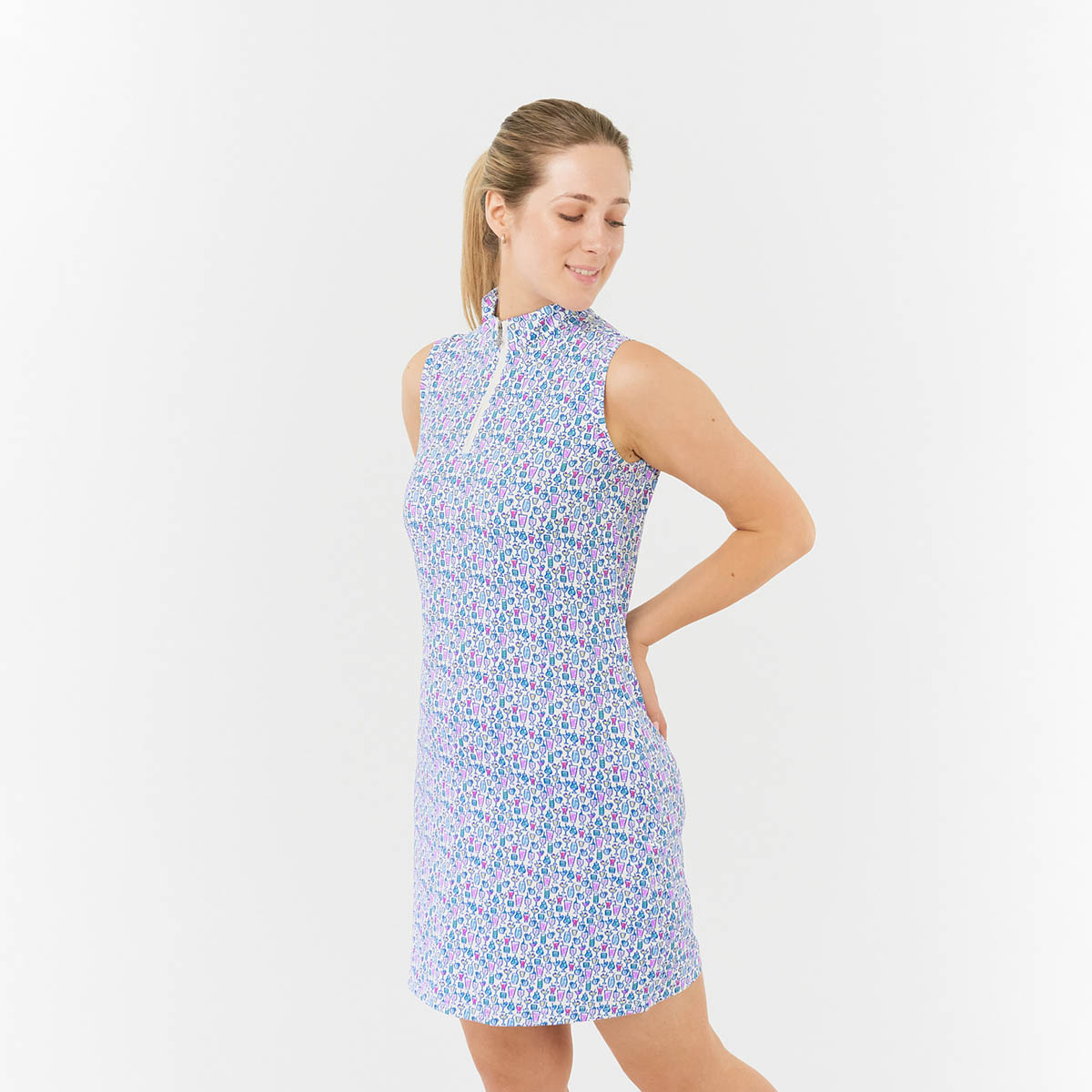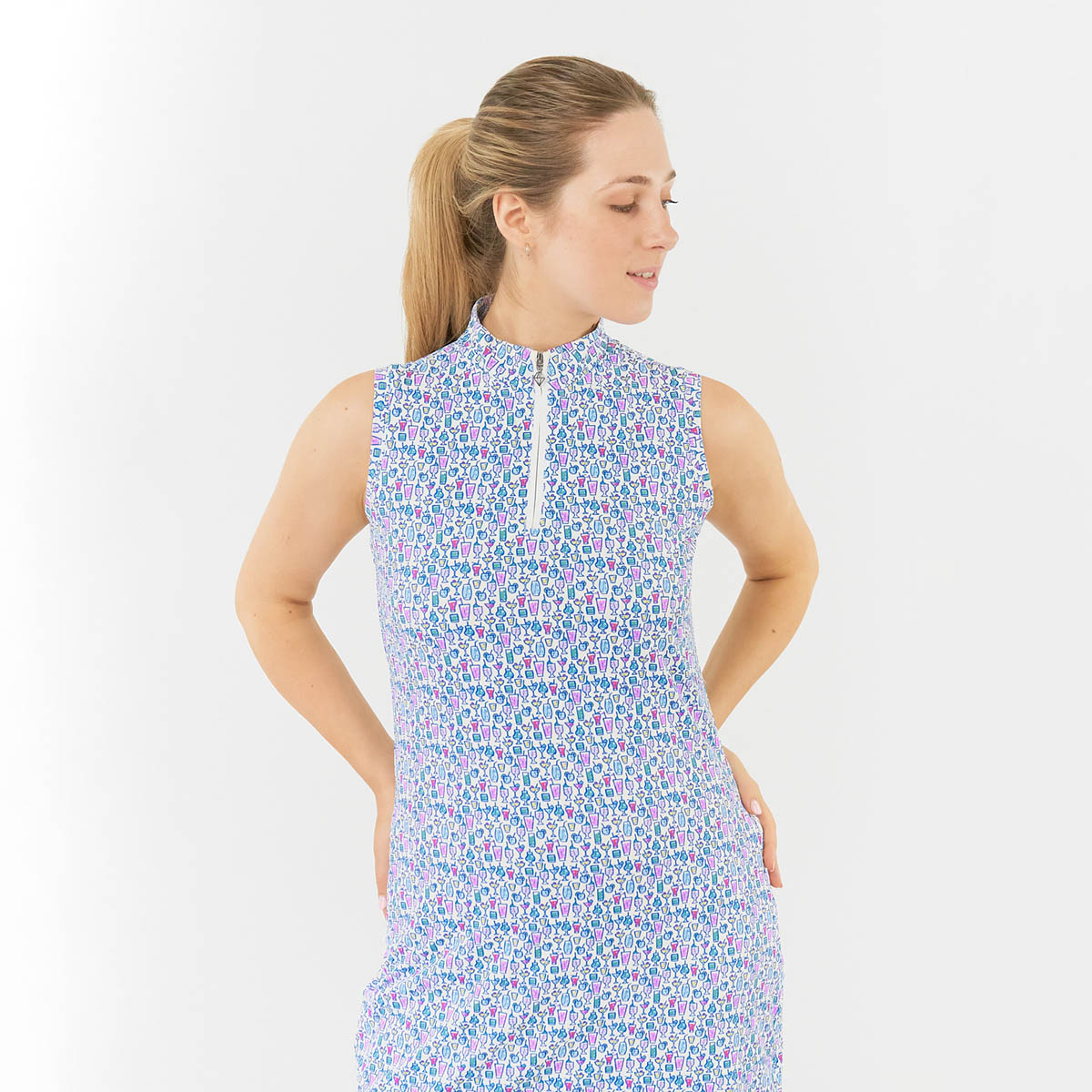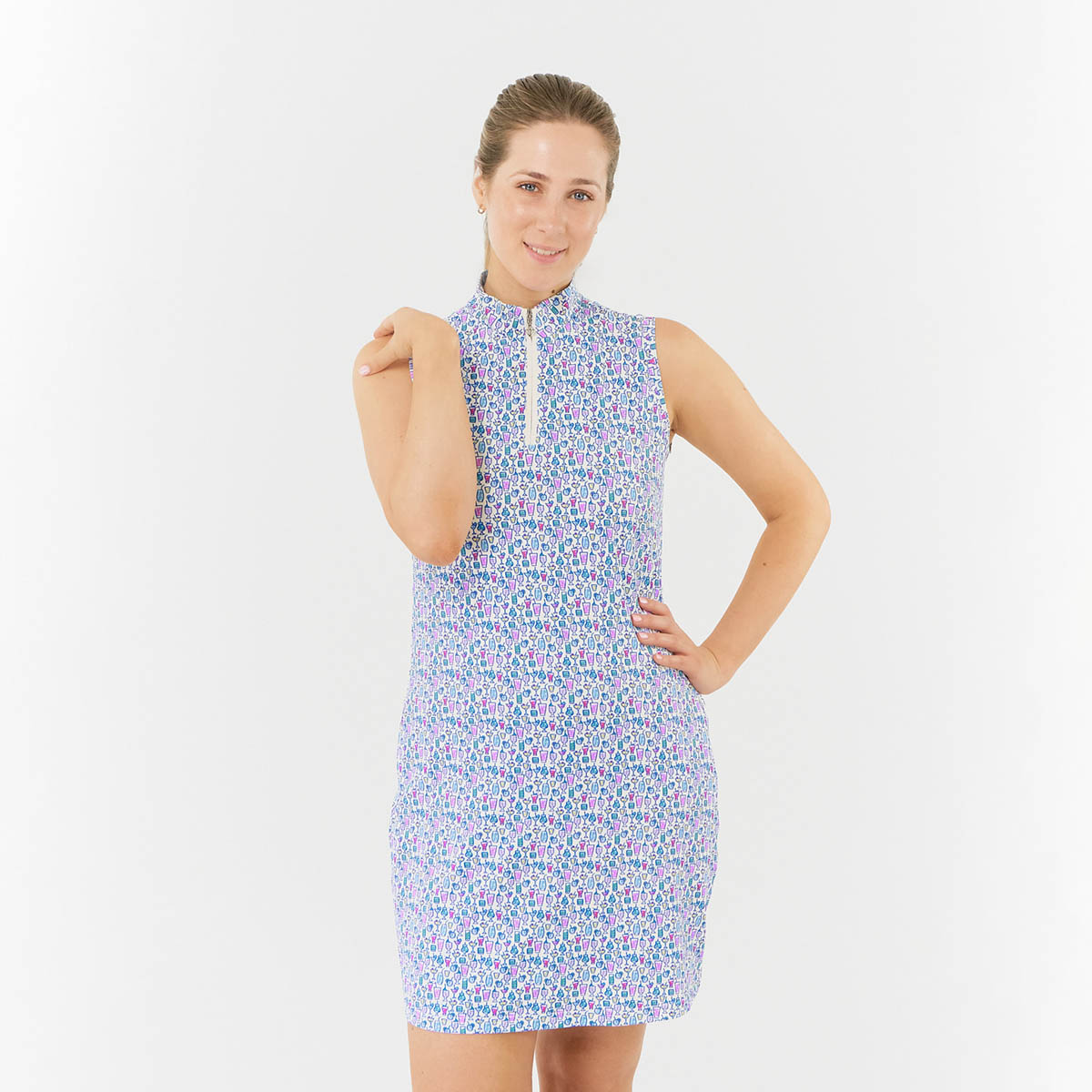 - 'Miley' sleeveless dress in 'Over Eighteen'; a multi-coloured, fun cocktail print design