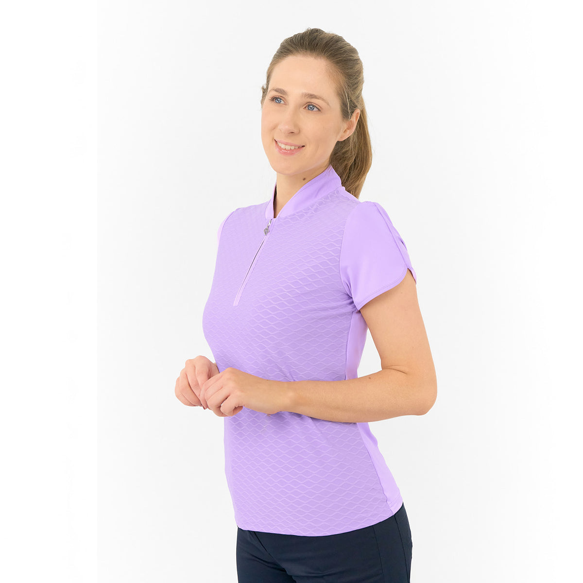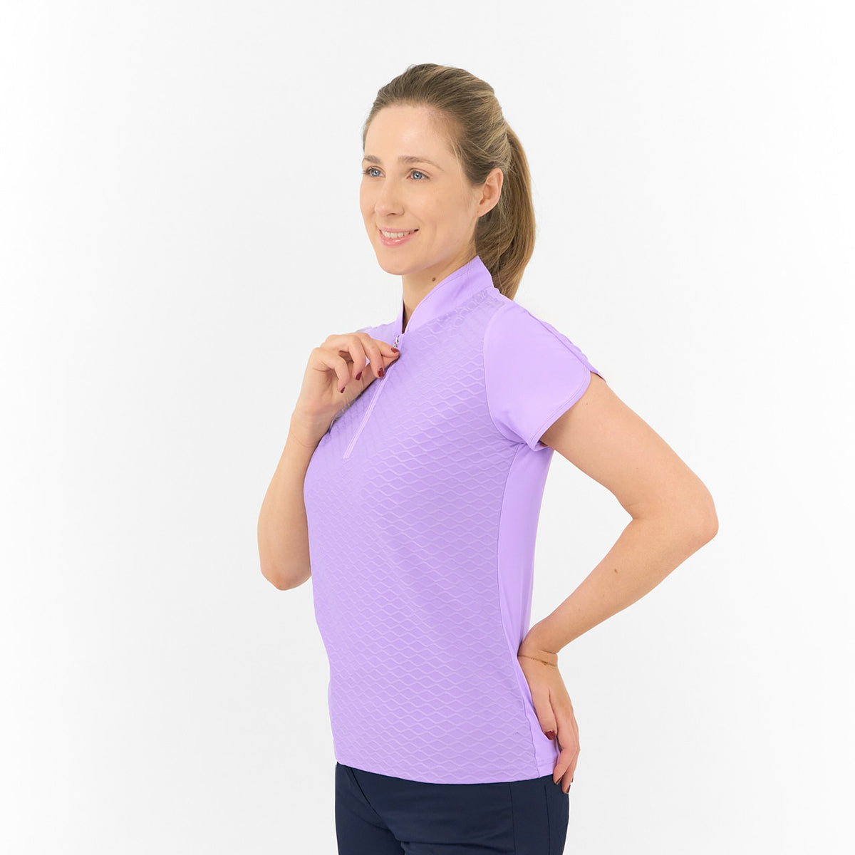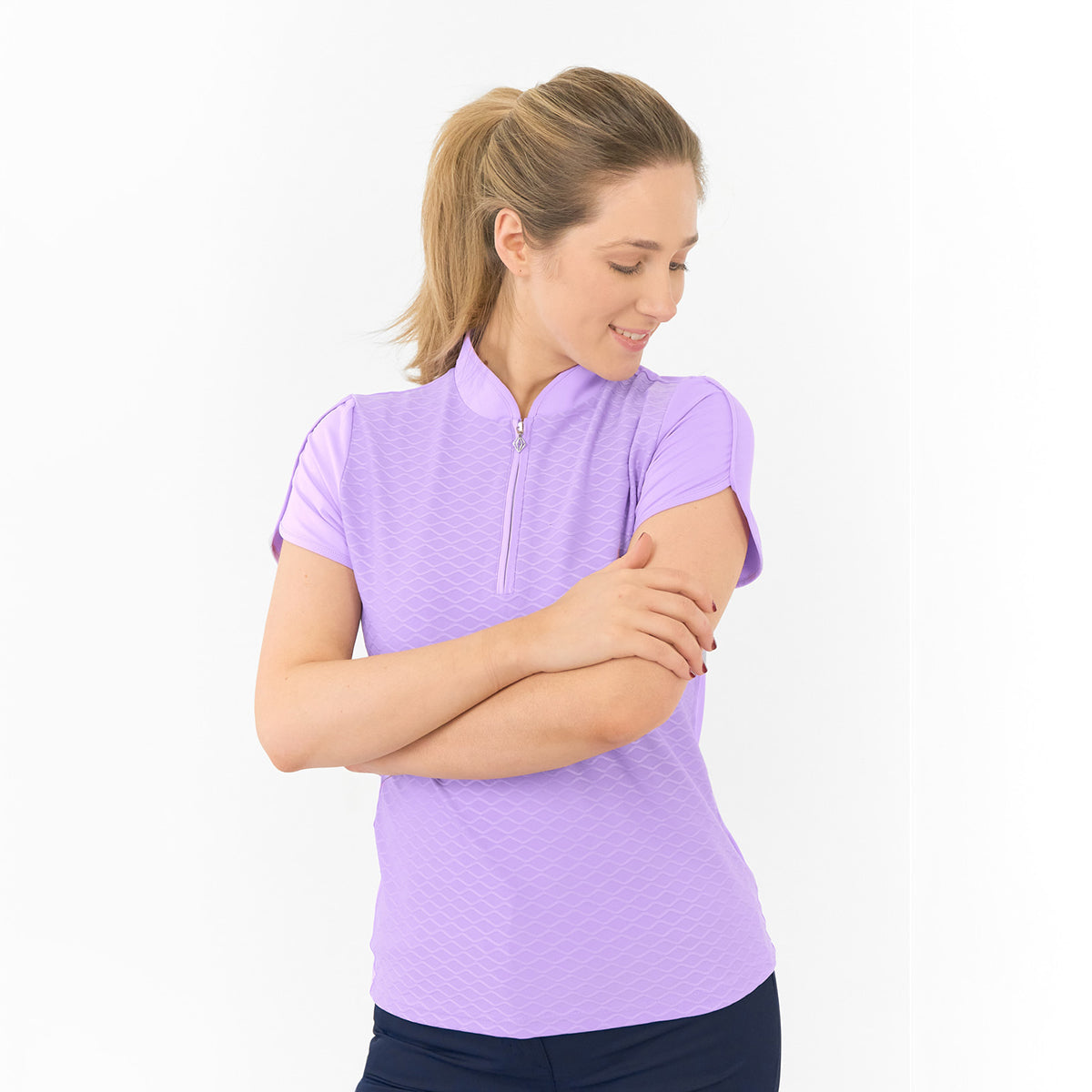 - 'Valley' cap sleeve polo in 'Lilac' with wave print on the front
