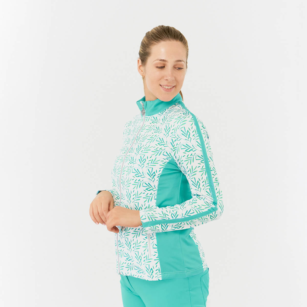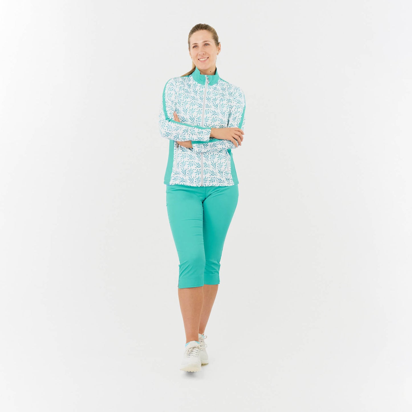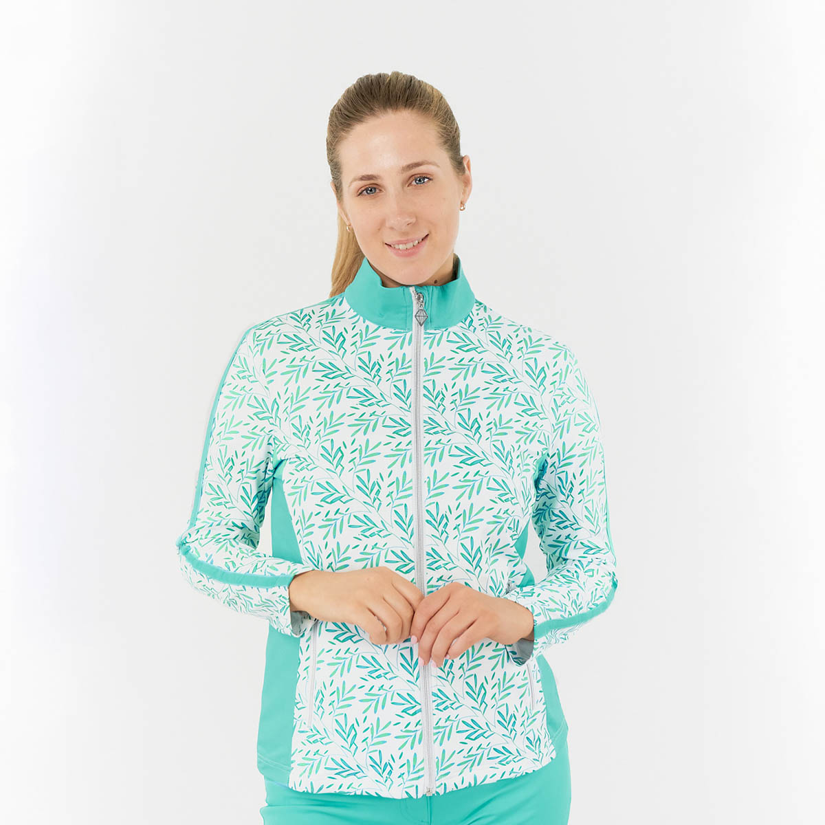 - 'Gella' mid-layer stretch jacket in 'Floating Palms'; a vibrant aqua & green palm print design