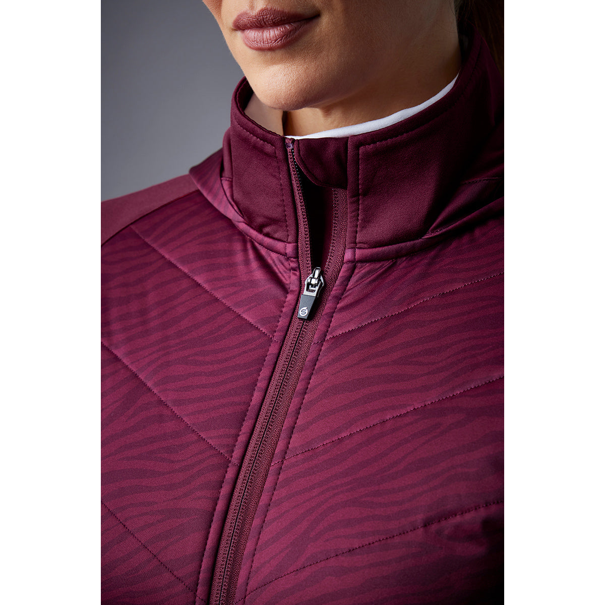 Make every stroke count with this elegant hybrid jacket from Sunderland in beautiful, rich burgundy. Created using a combination of performance-padded panels and a wind, soil, and stain-repellent stretch jersey, it provides superior warmth, comfort, and enhanced freedom of movement - along with style and versatility. The ever-so-subtle zebra print to the upper front body panel and hood adds a chic finishing touch to the design, making it the perfect go-to layer for on and off-course wear!