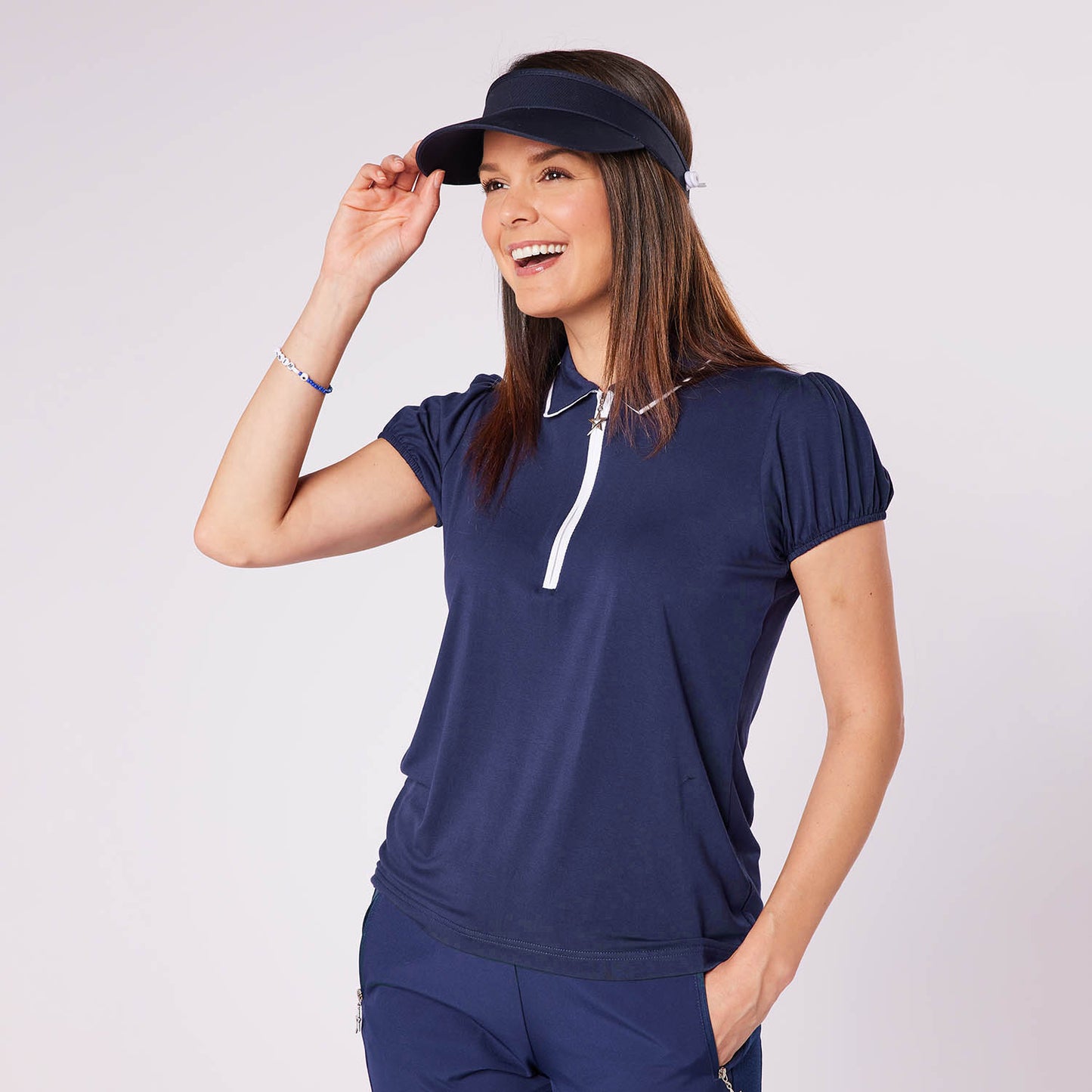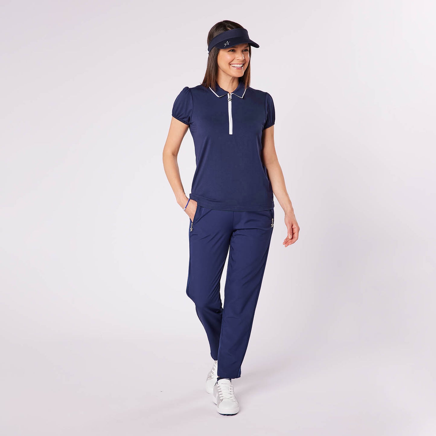 Swing Out Sister Ladies Zip-Neck Puffed Cap Sleeve Polo in Navy